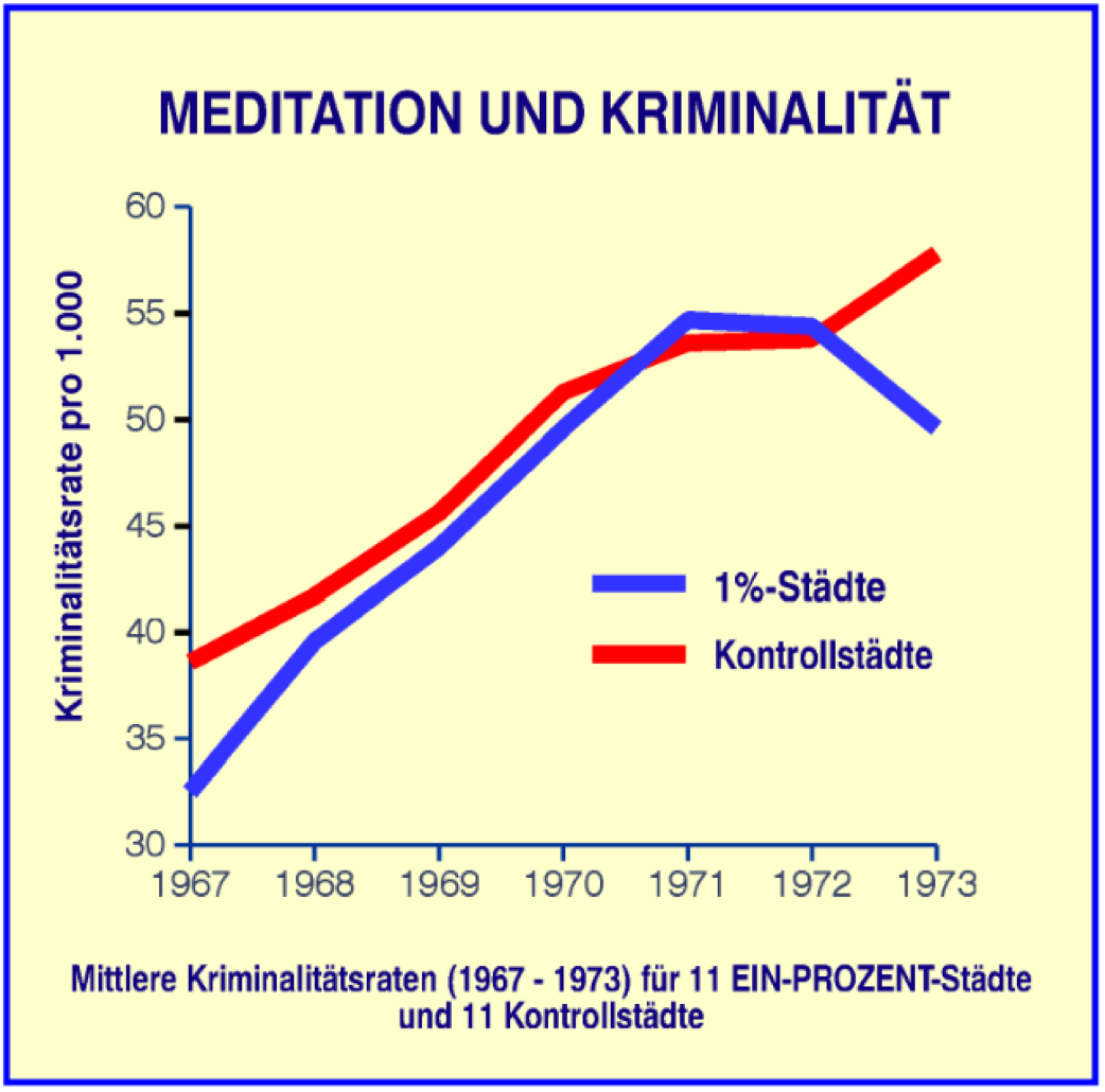 Speziell wenn große, einheitliche Gruppen meditierten, ließ sich dieser Effekt besonders deutlich messen. Wir stellten fest, dass bei größeren Gruppen, die intensiv fokus- siert waren, die Ergebnisse am stärksten waren. Es setzte ein starker kohärenter Effekt ein.