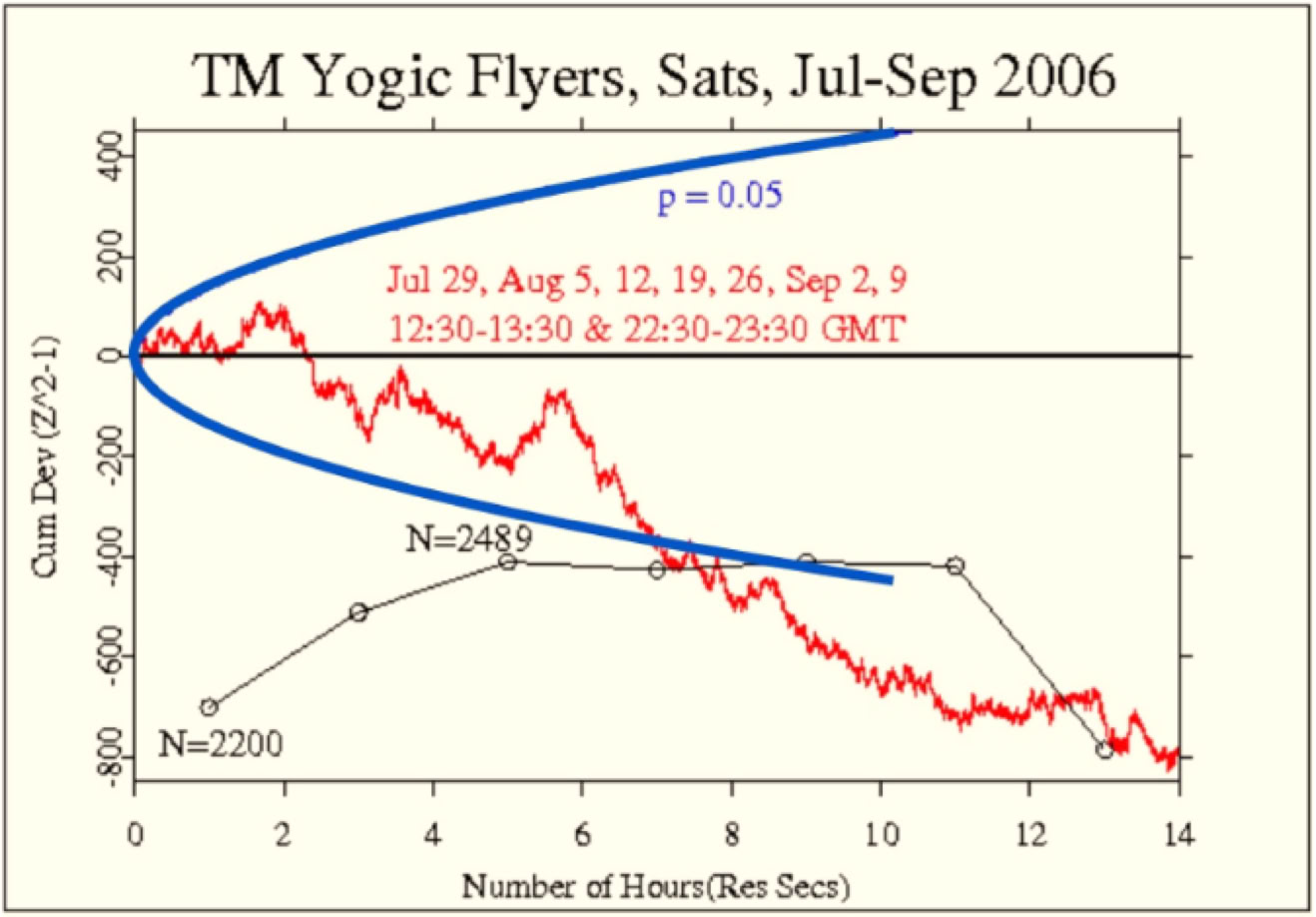 Das Ausmaß der Abweichung korrelierte mit der Anzahl der Personen, die sich zur Meditation versammelten. Das bedeutet: Je mehr Menschen meditierten, desto stärker war der Effekt. Zu Spitzenzeiten meditierten fast 2.500 Menschen, alles erfahrene Siddhi-Praktizierende, gleichzeitig.“
