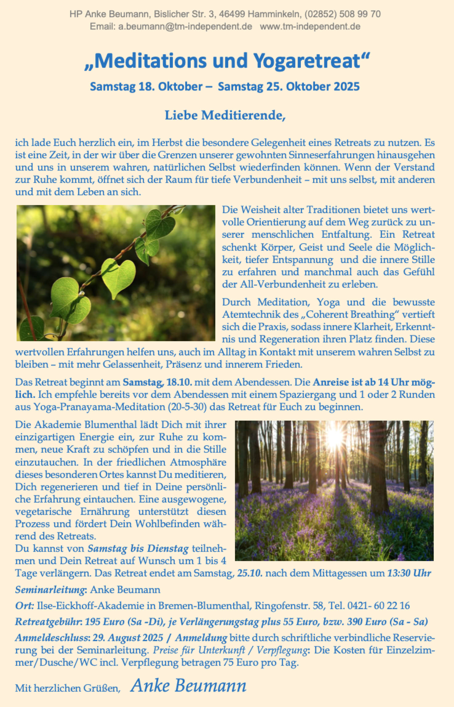 Hier geht es um die Erfahrung von tieferen Ebenen des BEWUSSTSEINs, nicht-dualistischer Vedischer MEDITATION (TM) Kohärenz-Atmung und die Erfahrung von Synchronizität zur Heilung von Körper, Geist und Seele.